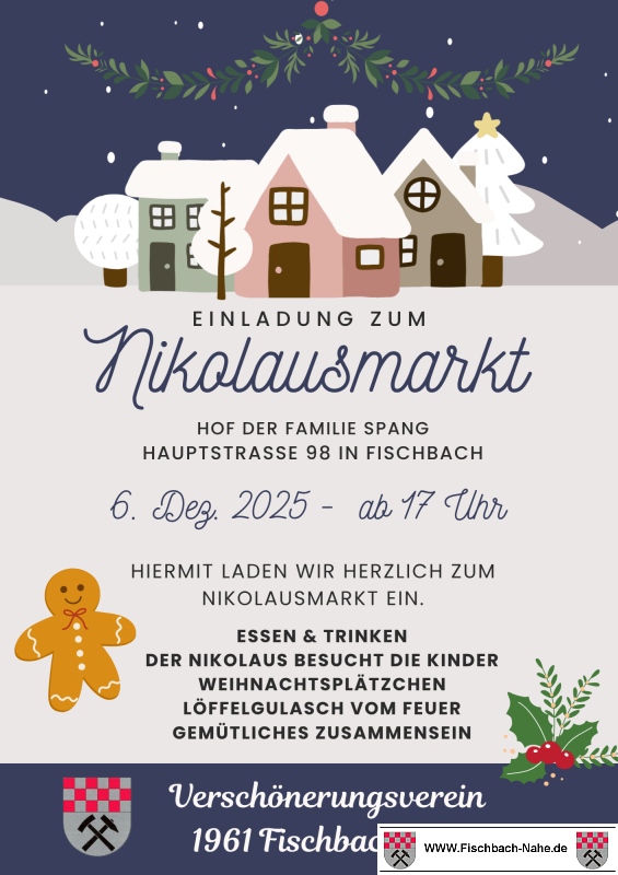 Am 6. Dezember lädt der Verschönerungsverein Fischbach herzlich zum stimmungsvollen Nikolausmarkt im Hof der Familie Spang in der Hauptstraße ein.